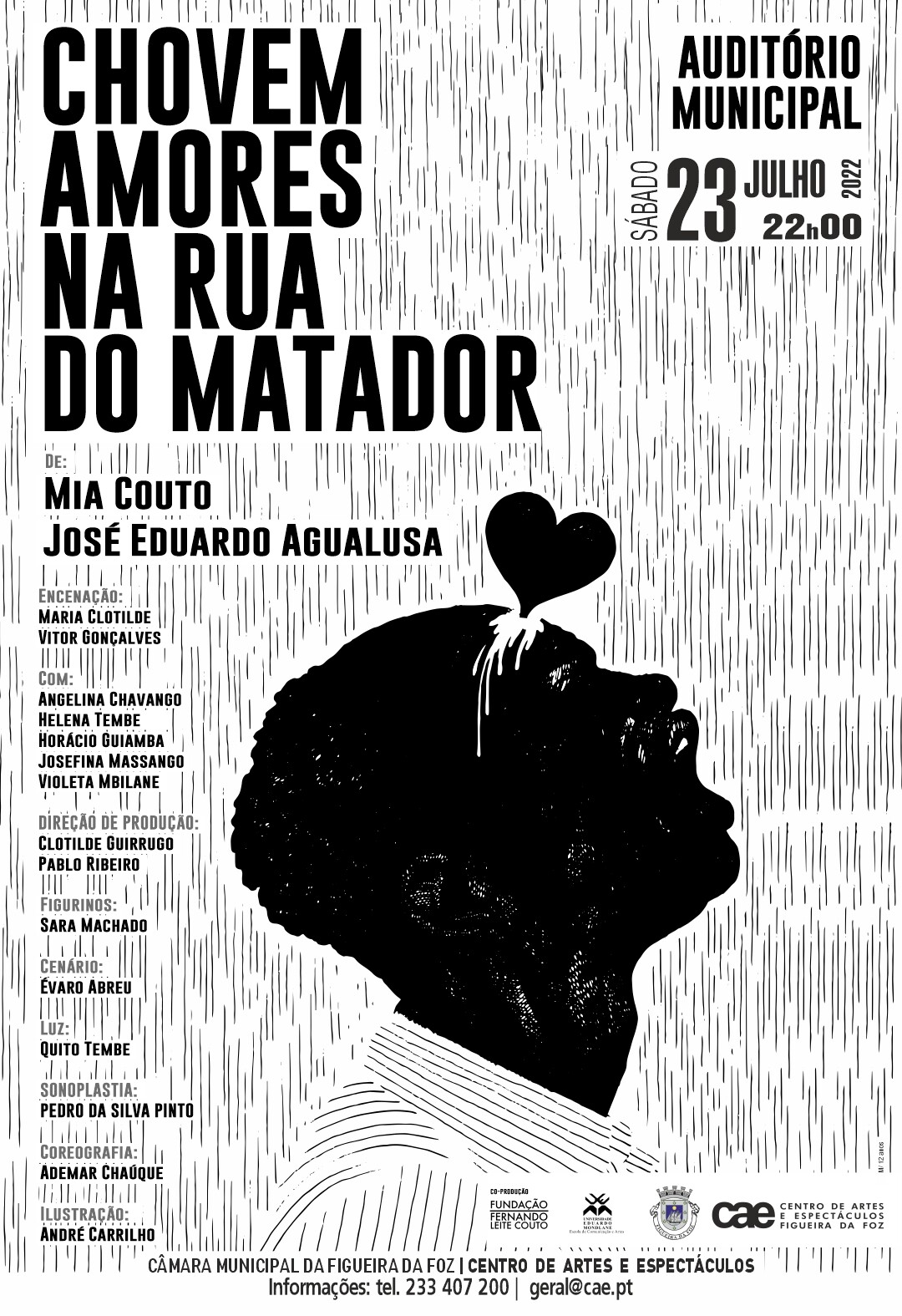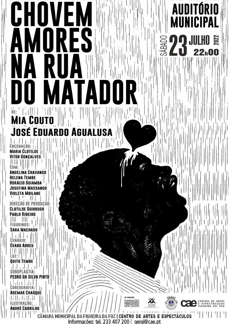 Autores: Mia Couto e José Eduardo Agualusa | Dramaturgia: Mia Couto | Intérpretes: Angelina Chavango, Horácio Guiamba, Joana Mbalango, Josefina Massango, Violeta Mbilane | Encenação: Clotilde Guirrugo e Vitor Gonçalves | Cenário: Evaro de Abreu | Figurinos: Sara Machado | Coreografia: Ademar Chauque | Música: Shigeru Umebayashi | Sonoplastia: Pedro da Silva Pinto | Luz: Quito Tembe | Direção de Produção: Clotilde Guirrugo, Pablo Ribeiro