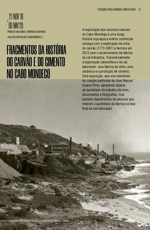 A exploração dos recursos naturais do Cabo Mondego é uma longa história cuja época melhor conhecida começa com a exploração da mina do carvão (1773-1967) e termina em 2013 com o encerramento da fábrica da cal hidráulica. Transversalmente à exploração carbonífera e da cal, laboraram uma fábrica de vidro, uma cerâmica e a produção de cimento. Esta exposição, que vive sobretudo da coleção particular de José Manuel Soares Pinto, apresenta objetos do quotidiano do trabalho da mina, documentos e fotografias, mas também depoimentos de pessoas que viveram o quotidiano da fábrica na fase final da sua laboração.