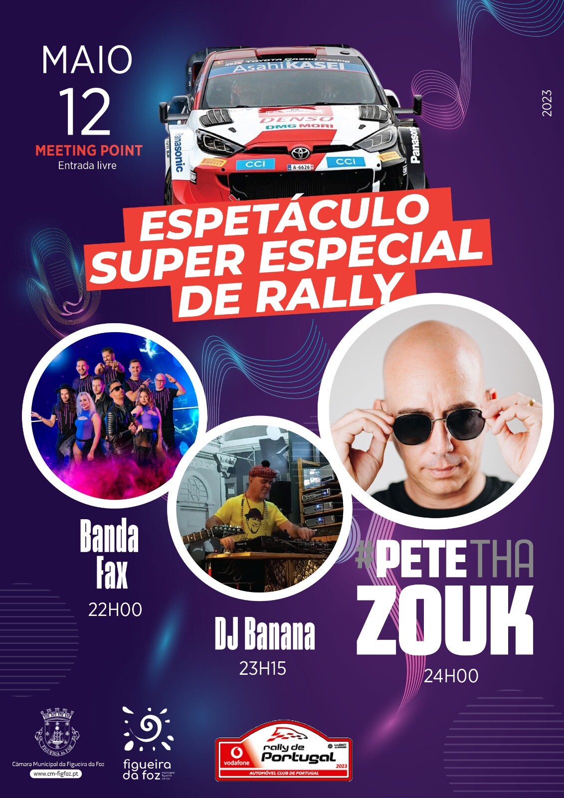 A partir das 22h00, o Município da Figueira da Foz promove, no Meeting Point- na Praceta Ledesma Criado, um «Espetáculo Superespecial de Rally».
