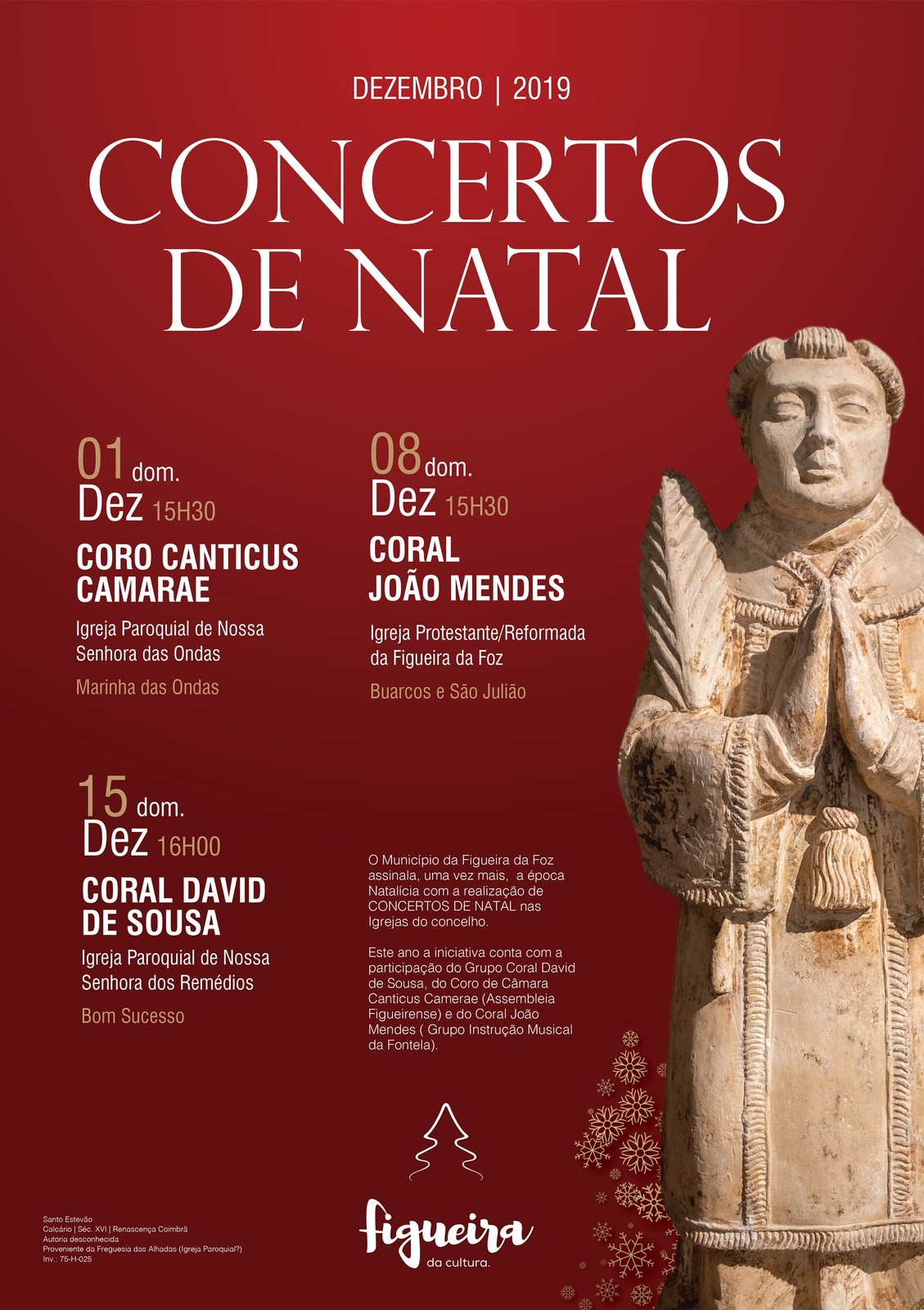 A Câmara Municipal da Figueira da Foz pretende mais uma vez assinalar a época Natalícia com a realização de CONCERTOS DE NATAL, nas Igrejas Paroquiais do concelho, visando promover valores de paz e amizade através da linguagem universal que é a música, em diversas freguesias do concelho.