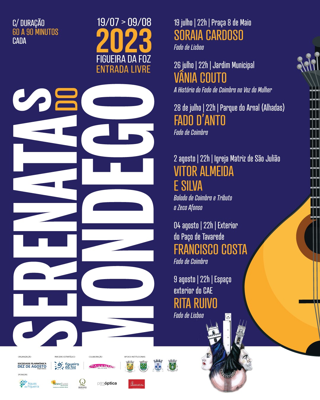 Promovida pela Sociedade Filarmónica 10 de Agosto, com o apoio do Município da Figueira da Foz, a edição de 2023 da iniciativa «Serenatas do Mondego» tem data de início agendada para esta quarta-feira, dia 19 de julho, pelas 22h00, na Praça 8 de Maio.