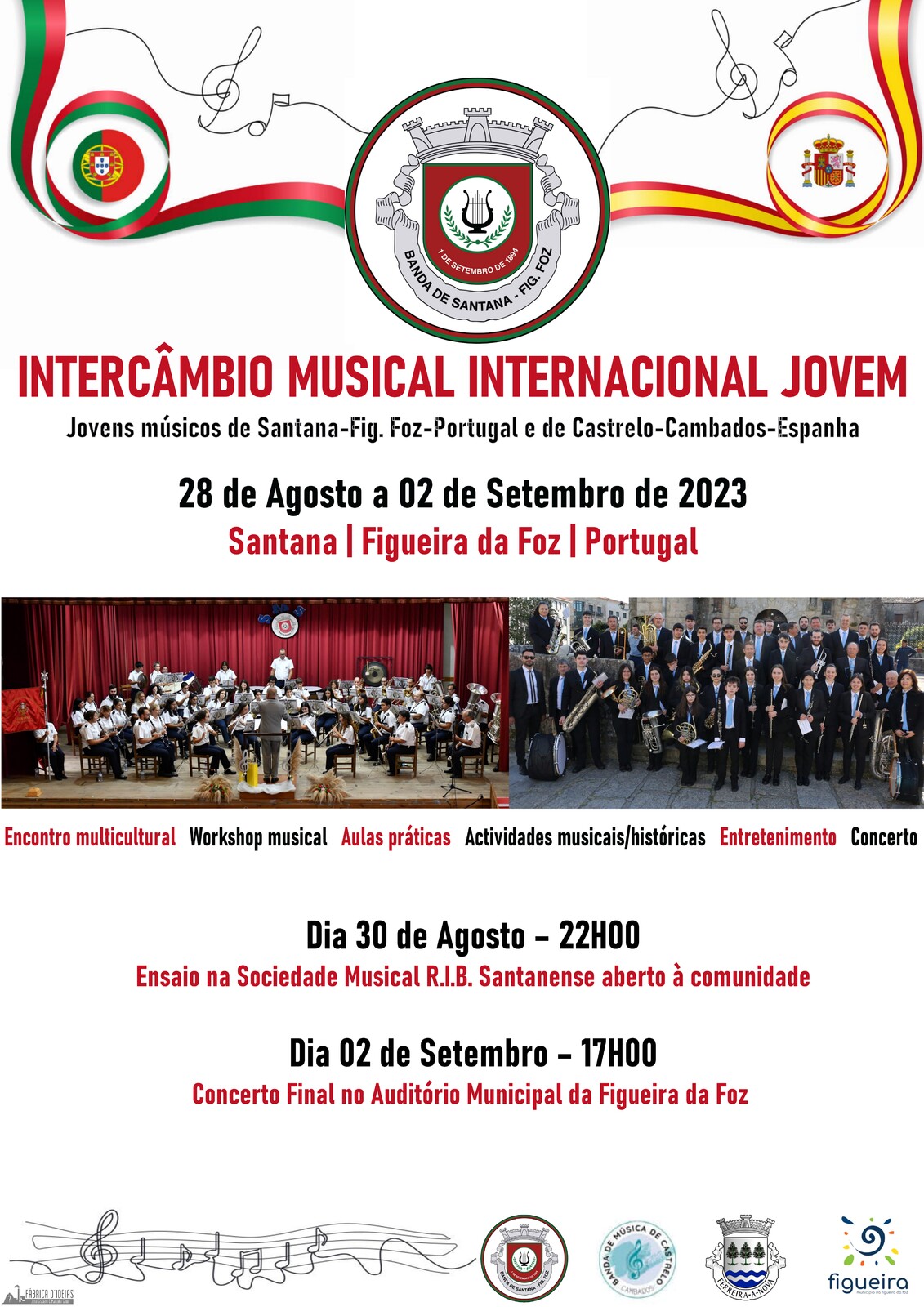 concerto de encerramento do Intercâmbio Internacional Jovem, com a participação da Banda de Música de Castrelo-Cambados-Espanha e a Banda de Santana--Figueira da Foz-Portugal, iniciativa promovida pela Sociedade Musical Recreativa Instrutiva e Beneficente Santanense com o apoio da Câmara Municipal da Figueira da Foz. O concerto vai ser dirigido pelos maestros Nicolás Portas Ricoy (Castrelo) e Francisco Relva Pereira (Santana).