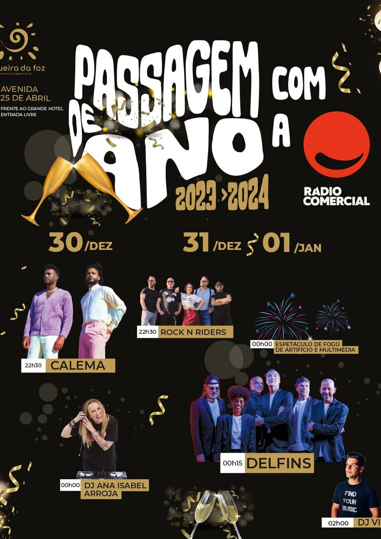 No dia 31 a banda figueirense Rock N Riders começa a "aquecer" o público às 22h30. À meia noite o céu transforma-se num arco-íris brilhante, com o espetáculo de fogo de artifício e multimédia. Quinze minutos depois entram em palco os Delfins, "para uma grande Celebração tripla: do Ano novo de 2024, da marca dos 40 anos de canções e também dos 50 anos do 25 de Abril!"