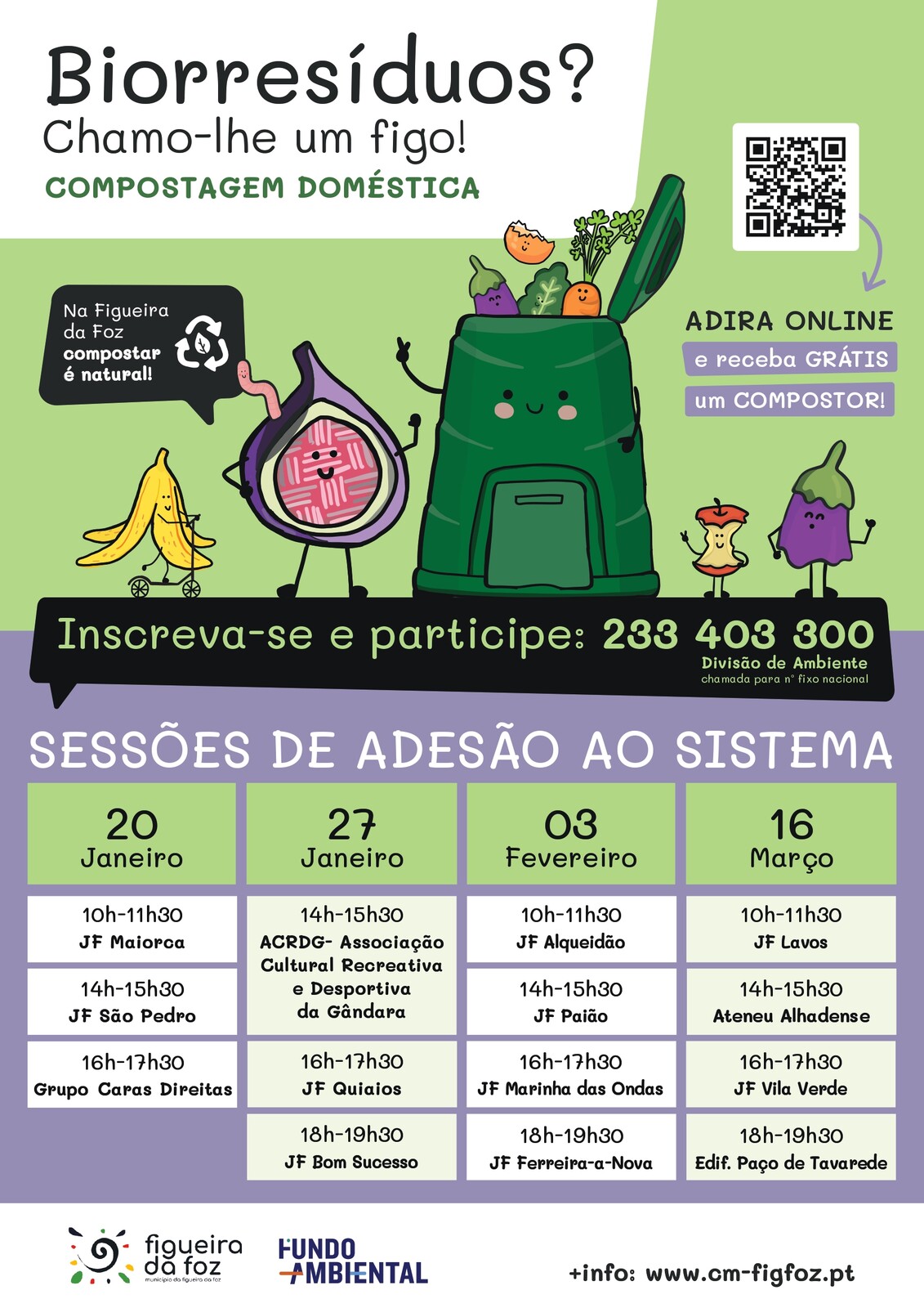 Se pretende receber um compostor doméstico de forma gratuita, inscreva-se (233 403 300 – Divisão de Ambiente, através do link , e participe numa das sessões que irão ter lugar em todas as freguesias do concelho.