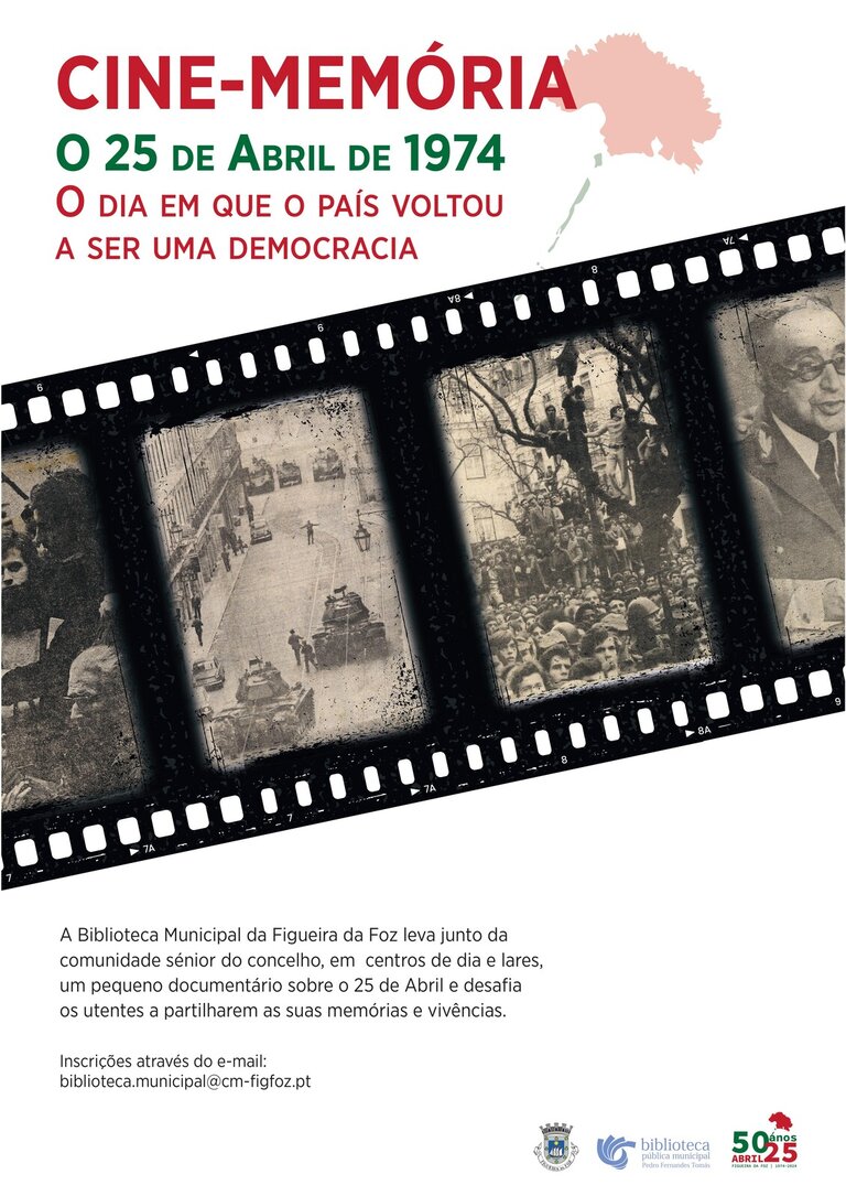 Assim, através do «Cine-Memória» - o 25 de Abril de 1974, o dia em que o país voltou a ser uma democracia, o serviço educativo da biblioteca municipal desafia os utentes dos lares e centros de dia a partilharem as suas memórias e vivências da Revolução dos Cravos.