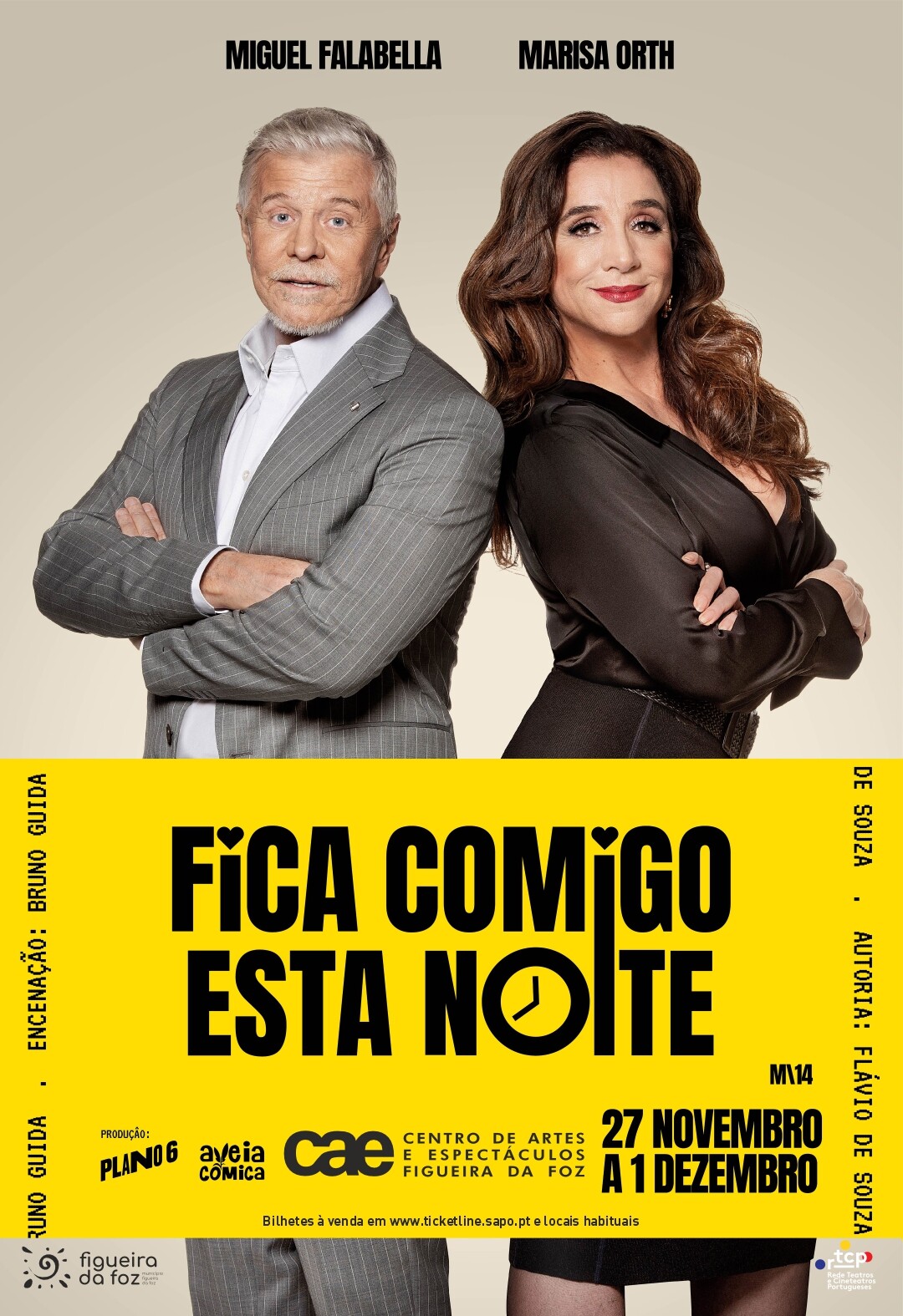 Da autoria de Flávio de Souza e com encenação de Bruno Guida, a peça “Fica Comigo Esta Noite” tem como intérpretes uma dupla que dispensa apresentação: Miguel Falabella e Marisa Orth.