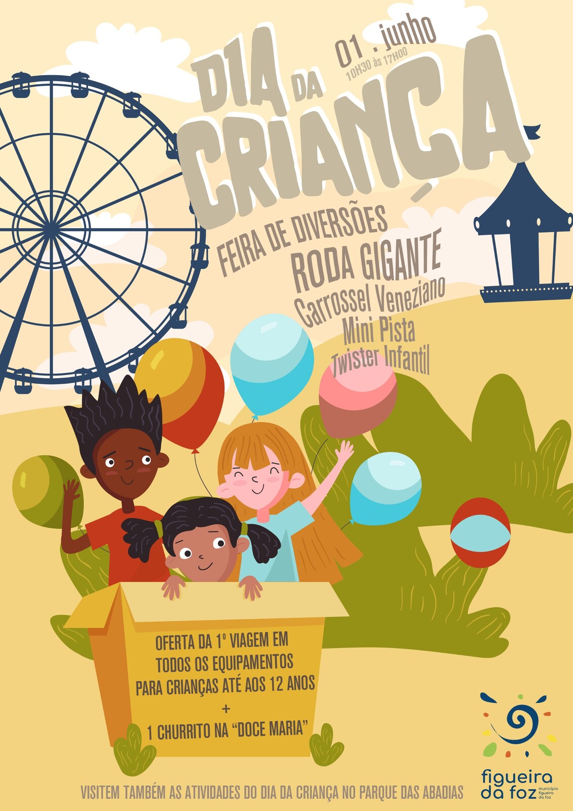 No dia 1 de junho, entre as 10h30 e as 17h00, as crianças até aos 12 anos vão poder usufruir da oferta de uma viagem (1 volta) em vários equipamentos instalados no Parque de Diversões do Parque de Estacionamento da Avenida de Espanha.
