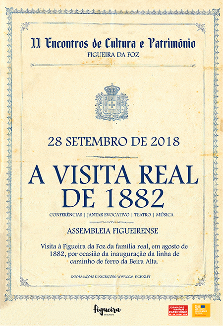 O Município da Figueira da Foz pela Divisão de Cultura, junta-se à iniciativa de sinalizar o Ano Europeu do Património Cultural 2018 e as Jornadas Europeias do Património, promovendo o II Encontros de Cultura e Património da Figueira da Foz focando a visita real de 1882, por ocasião da inauguração da linha de caminho de ferro da Beira Alta.