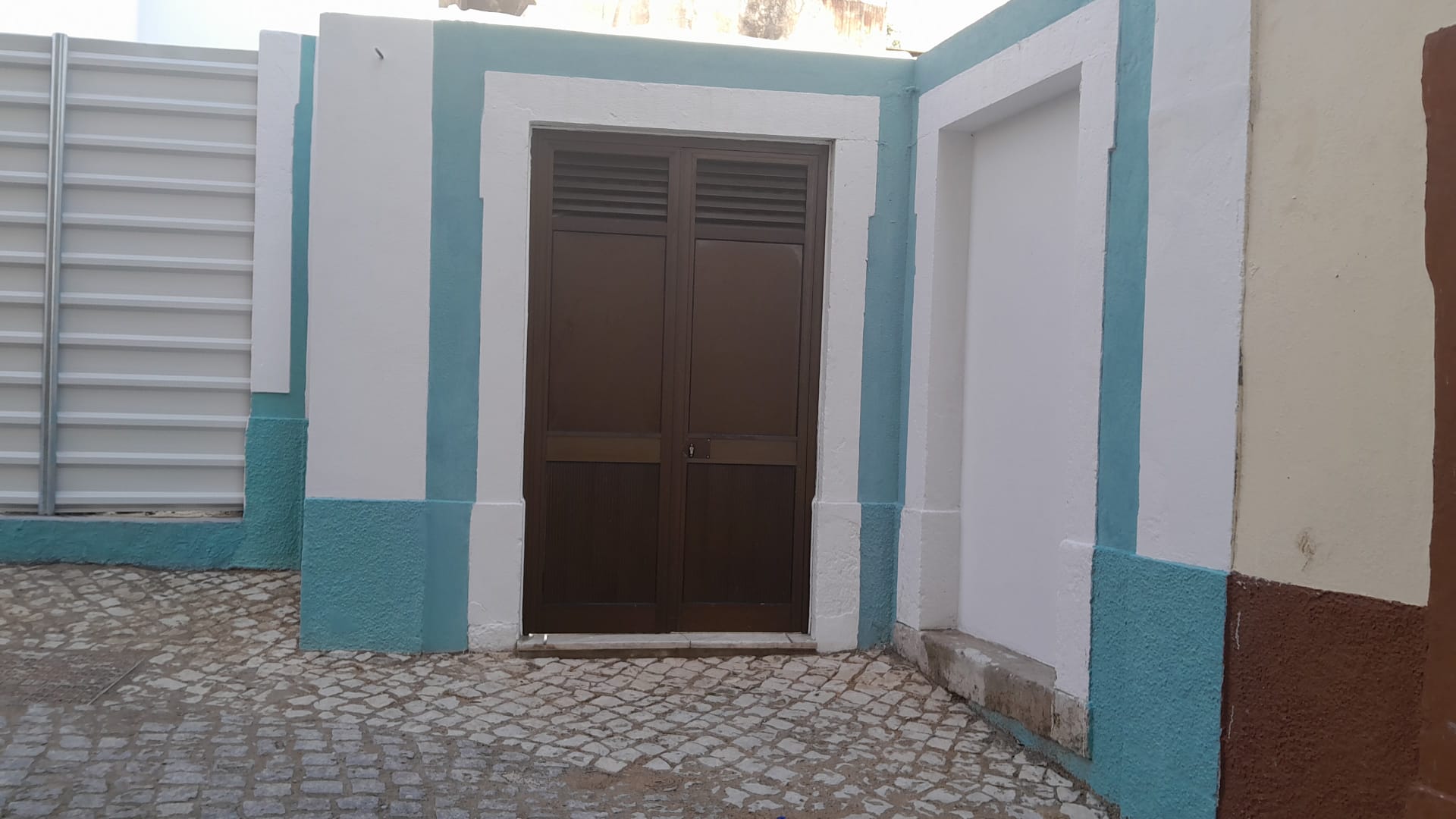 As paredes a manter foram tratadas e pintadas pelo exterior e para impedir a intrusão, a largura da fachada demolida, ao nível do chão, foi encerrada com tapumes.