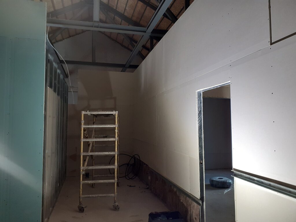 Encontram-se a ser executados os trabalhos de colocação de paredes divisórias, bem como instalação da rede de eletricidade, deteção de incêndios, água e saneamento.
